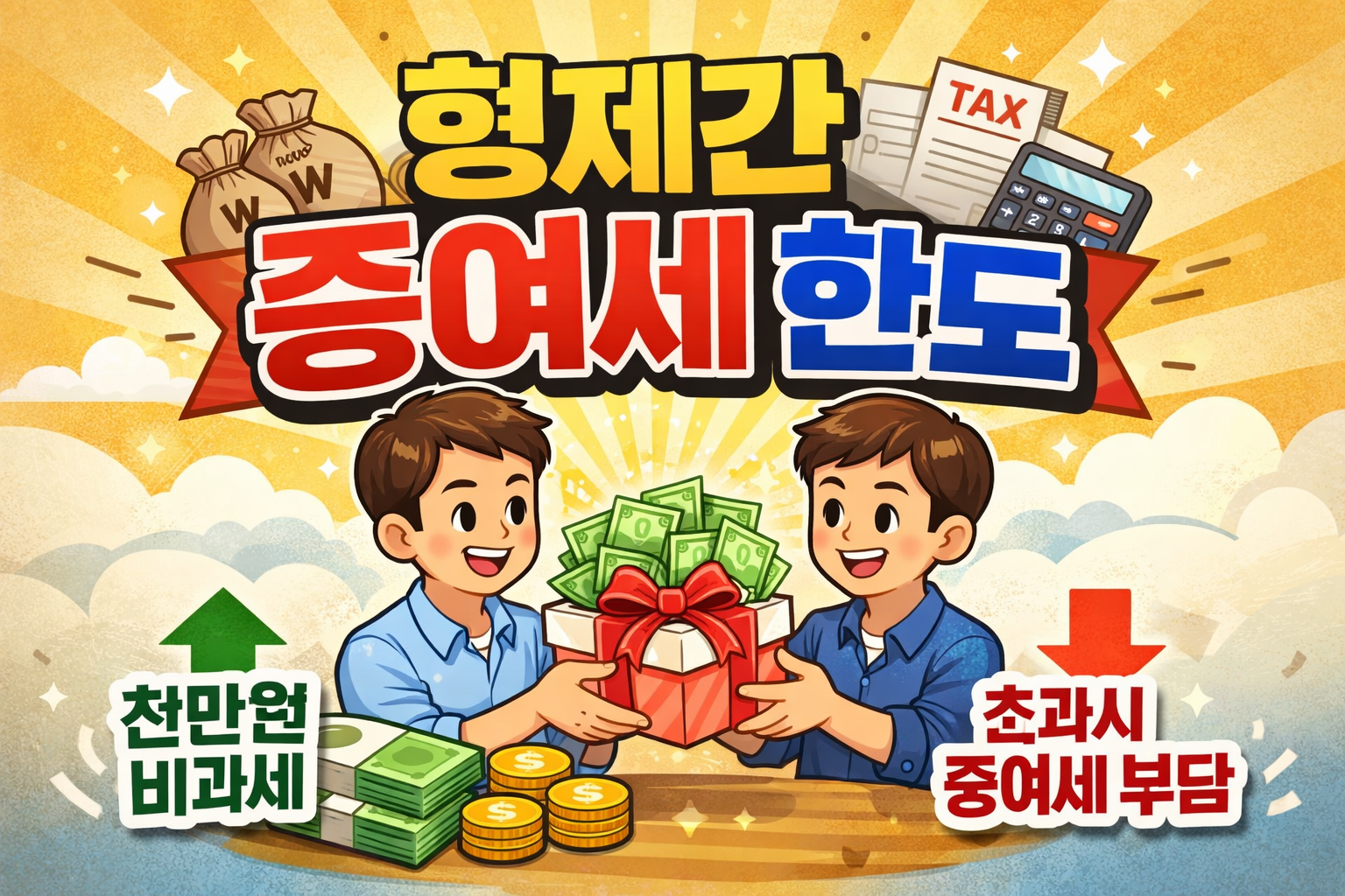 형제간 증여세 한도는 동일 증여자 기준 10년 합산 1천만 원입니다.