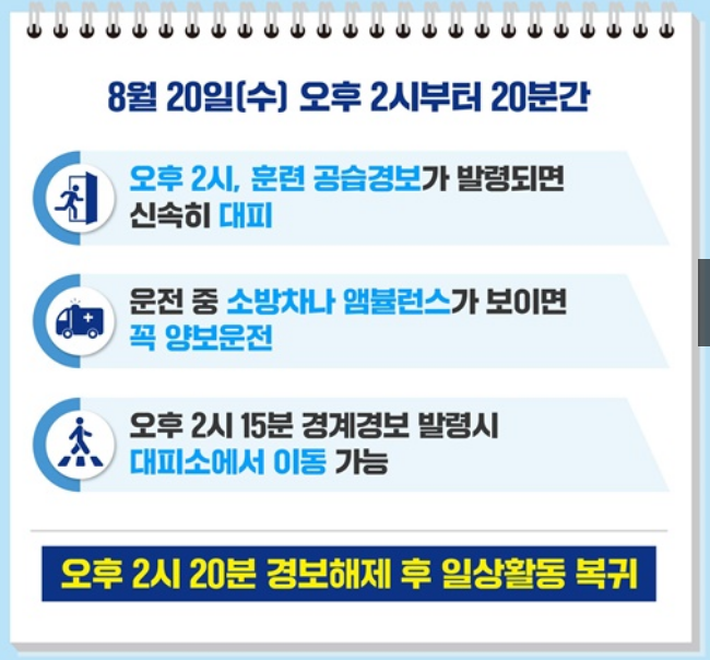 오늘 2025년 8월 20일 오후 2시, 전국적으로 울릴 공습경보 사이렌은 단순한 소리가 아닙니다. 그것은 국민 모두에게 “비상 대비 태세를 점검하라”는 신호입니다.