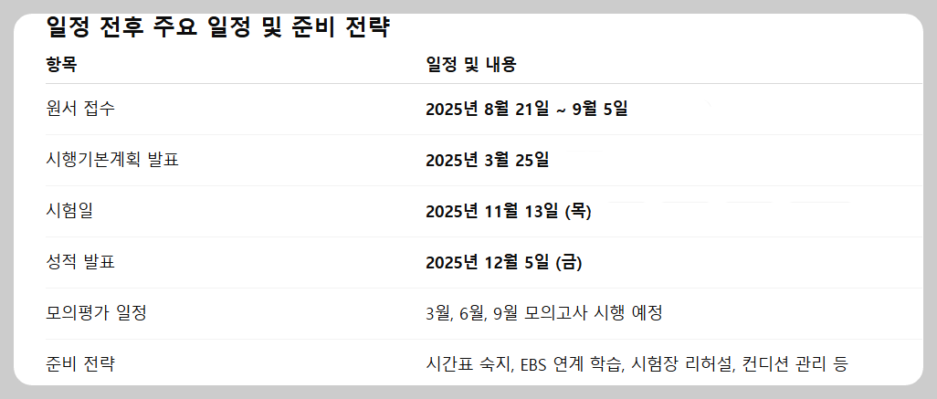 결국 수험생에게 중요한 것은 이 일정을 정확히 이해하고, 각 시기별로 해야 할 학습과 준비를 계획적으로 실행하는 것입니다.