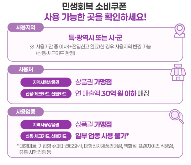 쿠폰은 연 매출 30억 원 이하 가맹점에서 사용할 수 있습니다. 생활비 필수 업종 대부분이 포함되어 있어 실질적 도움이 큽니다.