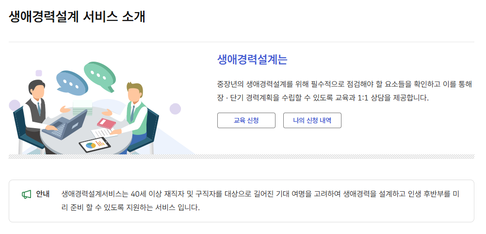 안내 생애경력설계서비스는 40세 이상 재직자 및 구직자를 대상으로 길어진 기대 여명을 고려하여 생애경력을 설계하고 인생 후반부를 미리 준비 할 수 있도록 지원하는 서비스 입니다.