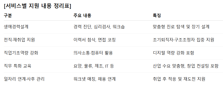 - 상담만으로는 한계가 있습니다. 교육·훈련 과정을 이수해야 실제 취업 기회와 연결됩니다.