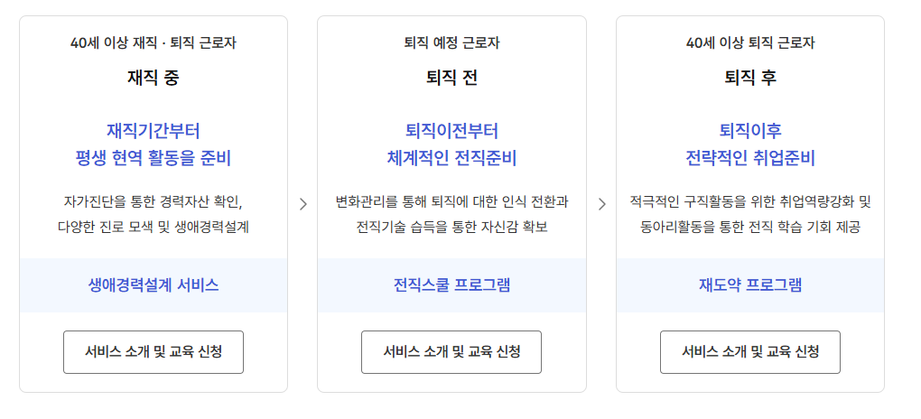 40세 이상 중장년층이 주 대상이며, 퇴직자, 경력단절자, 재취업 희망자, 창업 준비자 모두 무료로 지원받을 수 있습니다.