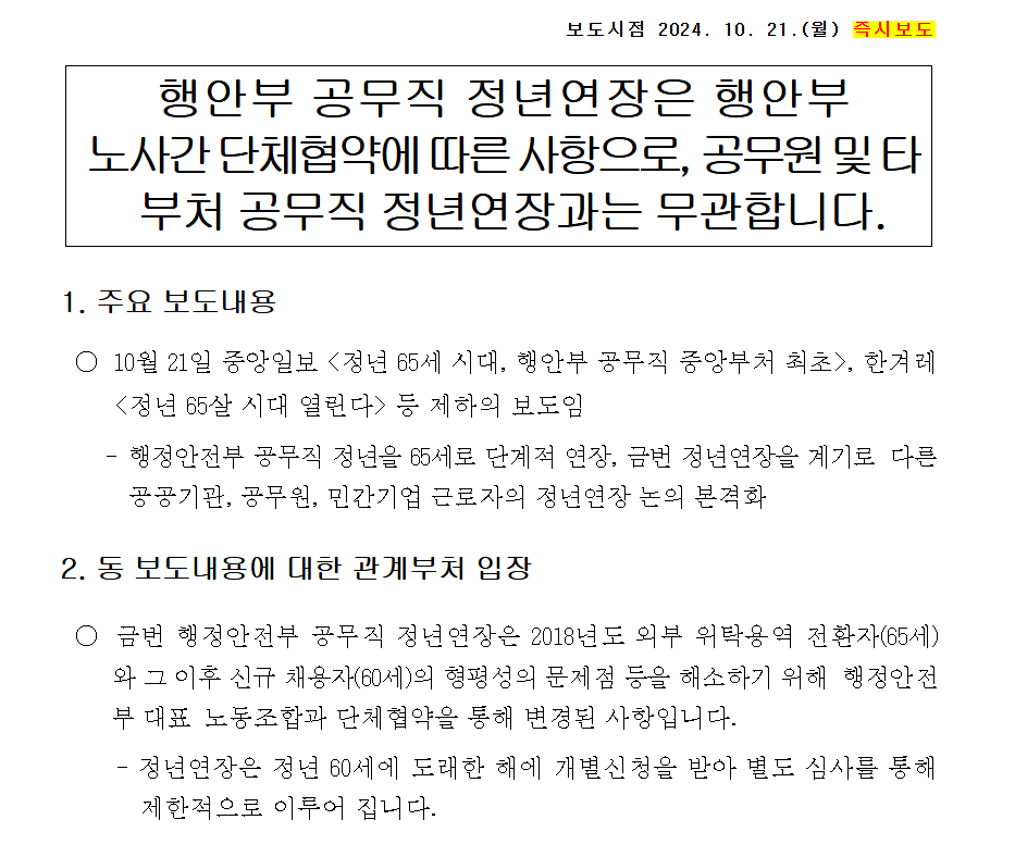 행정안전부는 2024년 10월, 중앙부처와 일부 지자체 무기계약직 근로자의 정년을 65세로 연장하는 방안을 공식 발표했습니다. 그러나 한 번에 모든 근로자의 정년을 65세로 올리는 것은 아닙니다.
