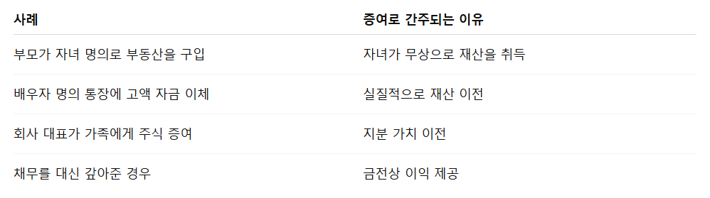 국세청 기준에 따르면, ‘무상 또는 거의 무상으로 타인에게 재산이나 이익을 이전받는 경우’ 모두 증여세 과세 대상입니다. 단순히 돈을 주고받는 경우뿐 아니라, 다음과 같은 사례도 증여로 간주될 수 있습니다.