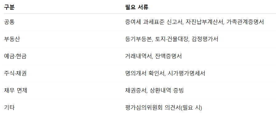 재산의 종류에 따라 필요한 증빙서류를 꼼꼼히 준비해야 합니다.