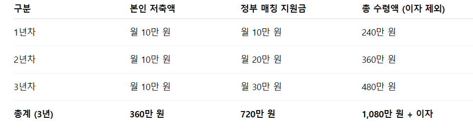 예를 들어, 3년간 매월 10만 원씩 저축할 경우 정부 지원금과 이자를 포함해 약 1,080만 원 이상을 받을 수 있습니다.
