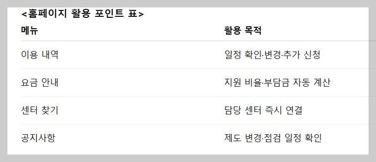 홈페이지는 단순히 신청 기능만 제공하는 것이 아니라 지역 센터 연결, 공지사항 확인, 감면 기준 조회, 서비스 유형 비교, 이용 내역 관리까지 전 과정을 통합해 제공하고 있습니다.