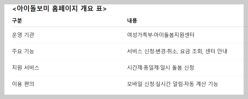 아이돌보미 홈페이지는 단순 신청창이 아니라 돌봄 이용 전 과정의 관리 플랫폼으로 기능하고 있습니다. 신청·변경·취소·요금 조회·센터 연결까지 모든 절차를 비대면으로 처리할 수 있기 때문에 이용자는 시간적 부담을 크게 줄일 수 있습니다.