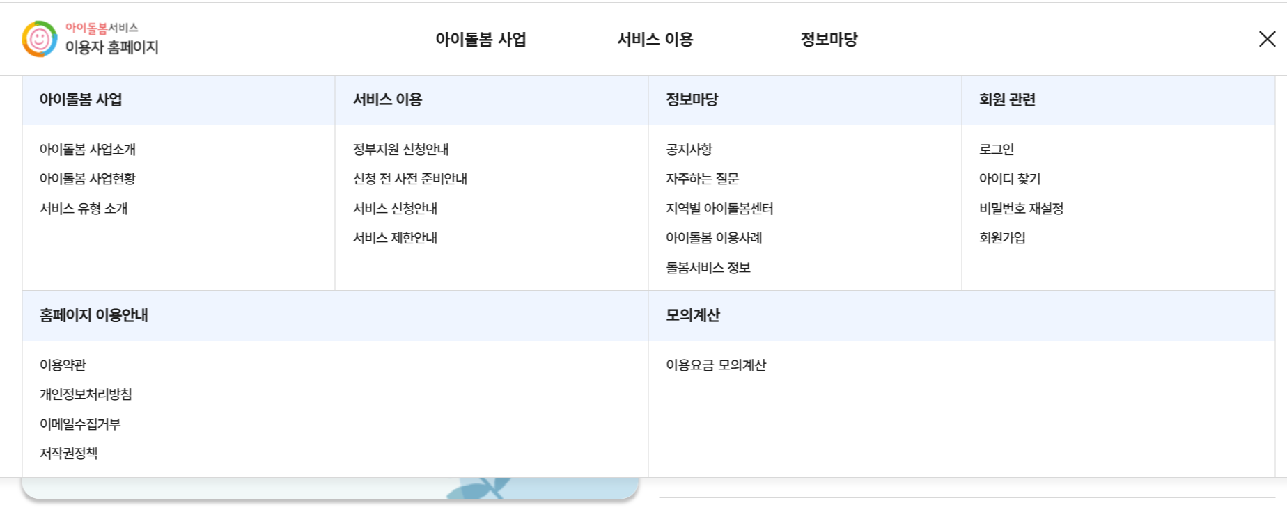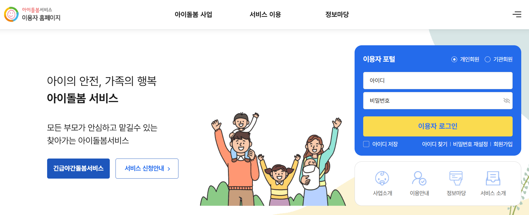 아이돌보미 서비스를 이용하기 위해서는 본인 인증 기반 회원가입이 필요합니다. 로그인 후 이용 신청 메뉴가 활성화됩니다.