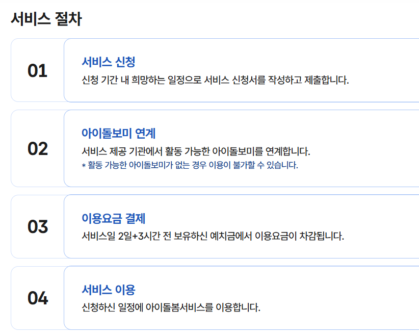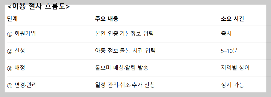 아이돌보미 홈페이지 이용 절차는 모바일에서도 한눈에 보이도록 단계별로 구성되어 있습니다. 회원가입부터 신청, 변경까지 모든 절차는 홈페이지 내에서 순차적으로 진행됩니다.