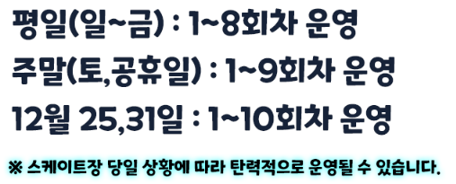 주말 및 공휴일에는 운영 시간이 연장되어 오전 10시부터 오후 11시까지 이용할 수 있습니다. 특히 토요일과 공휴일에는 야간 회차가 추가로 운영되어 늦은 시간까지 스케이트를 즐길 수 있습니다.