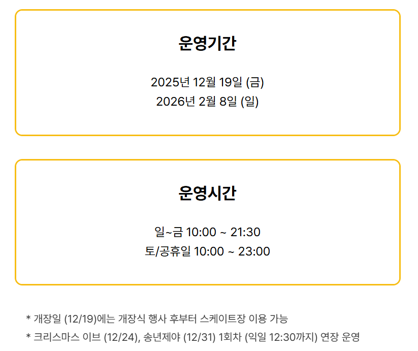 2025-2026 시즌 역시 기존 운영 기조를 유지하면서 2025년 12월 19일(금)부터 2026년 2월 8일(일)까지 약 두 달간 운영될 예정입니다.