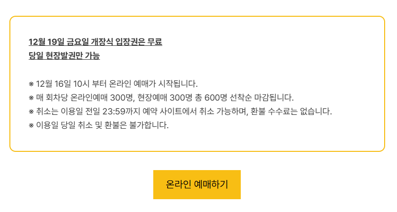 이용 방식은 온라인 사전예약이 원칙입니다. 회차별 인원이 제한되어 있기 때문에 원하는 시간대가 있다면 사전 예매를 통해 방문하는 것이 권장됩니다.