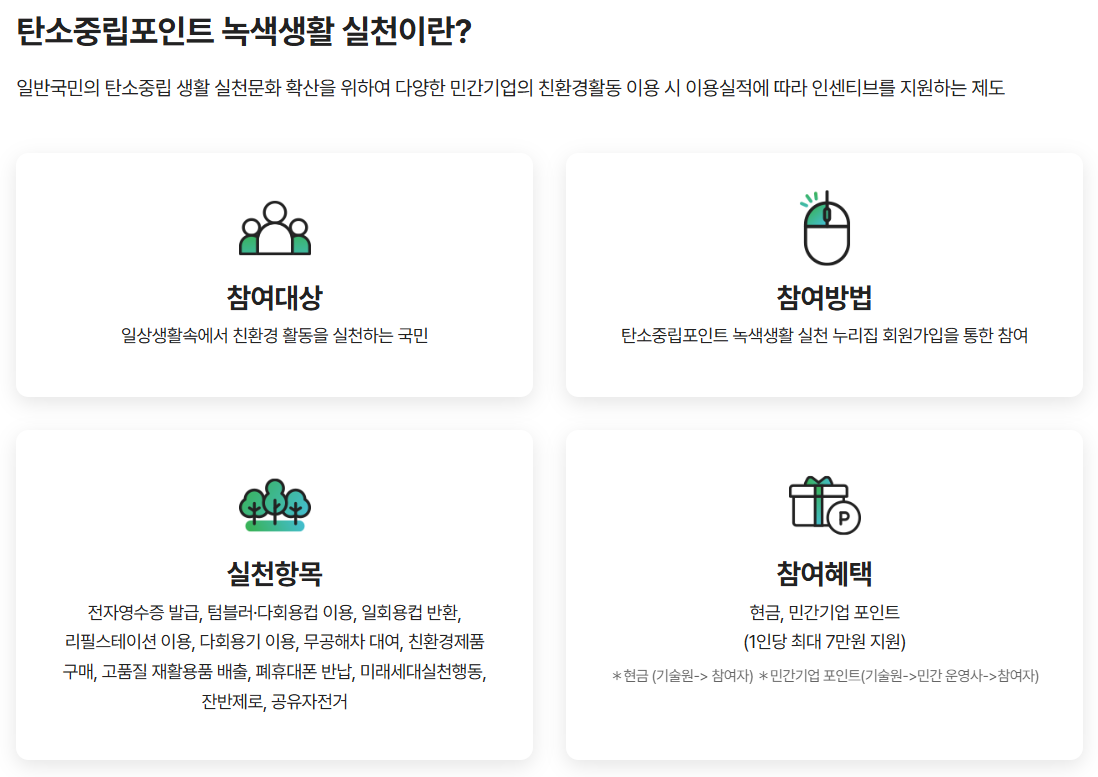 즉, 탄소중립 실천포인트제 홈페이지는 ‘정보 제공용 사이트’가 아니라 정책 참여의 실무 창구라고 볼 수 있습니다.