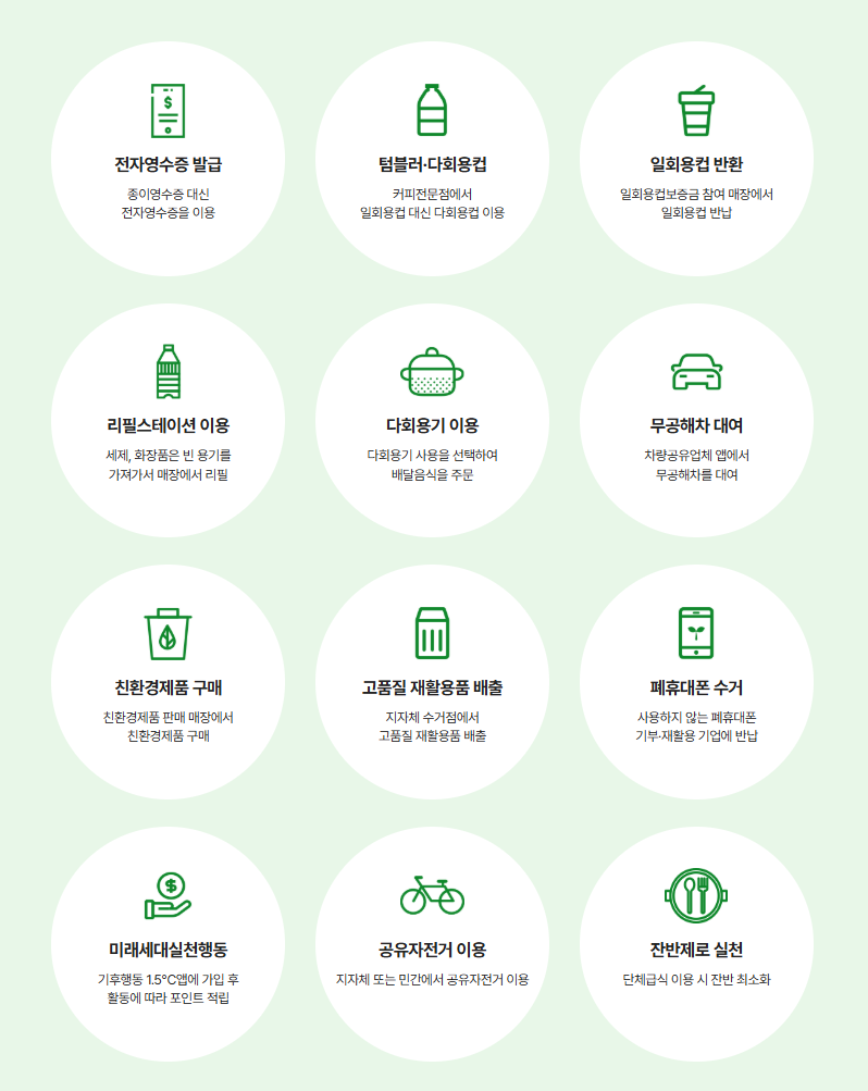 전자영수증 발급 이용, 다회용컵 사용, 리필스테이션 이용, 친환경 인증 제품 구매, 고효율 가전제품 구매 등이 여기에 포함됩니다.