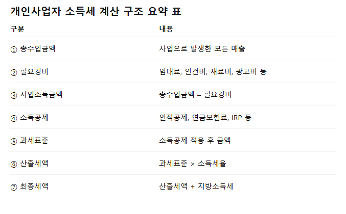 개인사업자 소득세는 일정한 계산 흐름을 거쳐 산출됩니다. 먼저 사업을 통해 발생한 총수입금액을 기준으로 합니다.