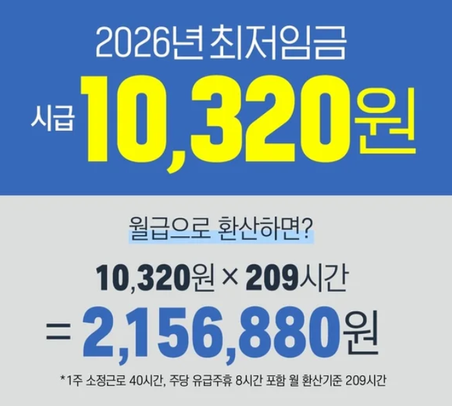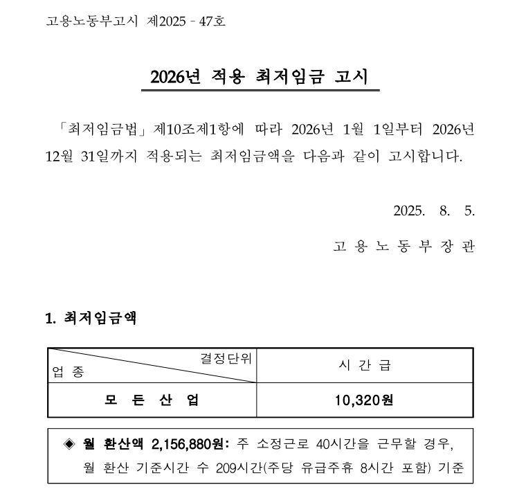 2026년도 최저임금이 시간급 10,320원으로 확정됐다. 월급으로 얼마인지, 적용 대상은 누구인지, 2026 최저임금 핵심 기준을 한눈에 확인할 수 있다.