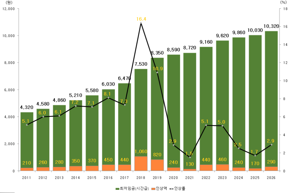 2026년도 최저임금은 전년도인 2025년 최저임금 10,030원보다 290원 인상된 금액이며, 인상률은 2.9%입니다. 해당 수치는 고용노동부 고시 기준으로 확정된 공식 수치입니다.