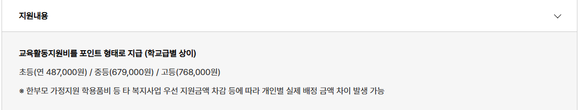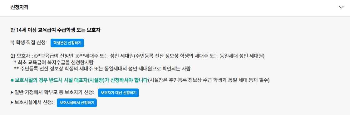 신청자격은 기준 중위소득 50% 이하라는 명확한 기준이 있으며, 학년별 차등 지급과 사용처 제한이라는 구조를 갖고 있다.