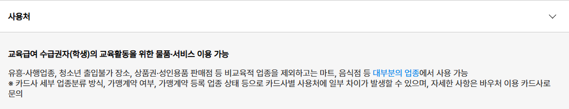 대표적으로 온라인 서점, 오프라인 문구점, 학습 교재 판매처 등이 포함된다. 다만 모든 가맹점에서 무조건 사용 가능한 것은 아니며, 교육 목적과 무관한 업종에서는 결제가 제한된다.