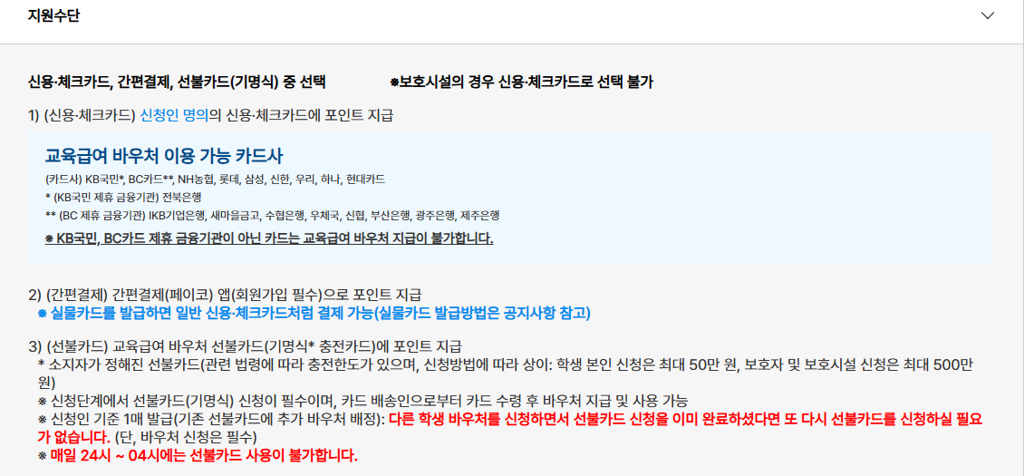 지급 방식은 교육급여 바우처 카드 또는 포인트 형태로 제공되며, 현금 인출은 불가능하다. 이는 지원금이 교육 목적 외 사용으로 전용되는 것을 방지하기 위한 조치다.