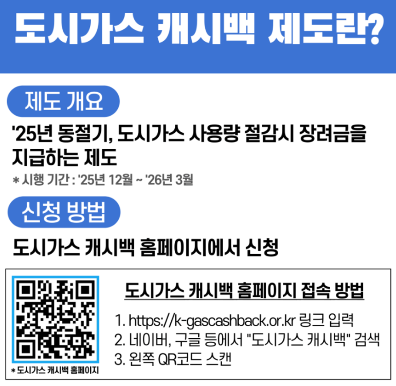 도시가스 캐시백은 단순한 할인 제도가 아니라, 사용 습관에 따라 실질적인 혜택을 받을 수 있는 구조입니다. 제도 내용을 정확히 이해하고 참여한다면 겨울철 난방비 부담을 줄이는 데 도움이 됩니다.